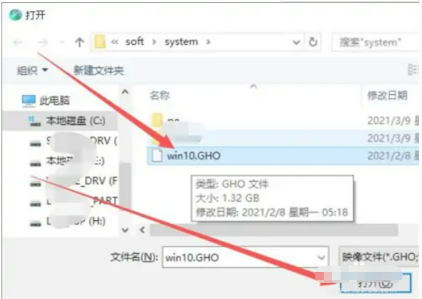 3、在“打開”彈框當中,選中【win10.GHO】,單擊【打開】。