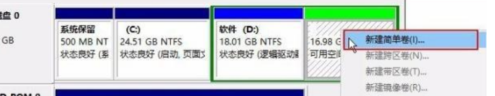 4、刪除原來的卷后,原來的磁盤就變成了綠色的磁盤,接著鼠標右擊選擇“新建簡單卷”。