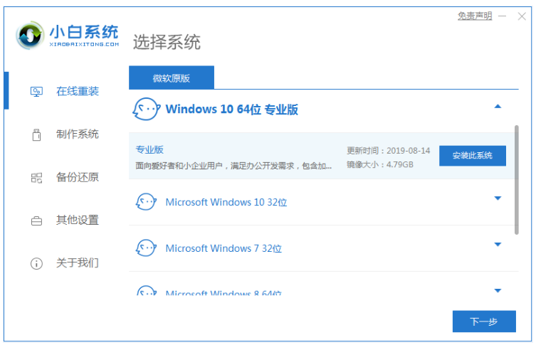 1、下載安裝小白一鍵重裝軟件到電腦上,點擊打開,選擇需要安裝的win10系統,點擊下一步。