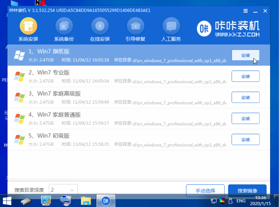 5、在pe系統桌面打開咔咔裝機工具,選擇需要的系統點擊安裝到系統盤c盤。