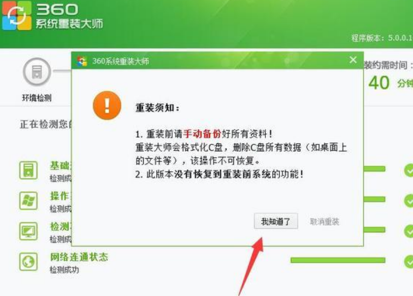 2、點擊重裝環境檢測,重裝大師會自動進行重裝。