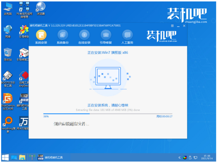 5、在pe系統,雙擊打開裝機吧裝機工具,選擇我們需要安裝的win7系統,點擊安裝到系統盤c盤。