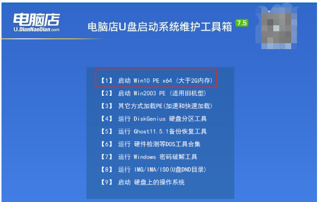 9、進入電腦店主菜單后,通過“↑↓”鍵選擇“【1】啟動Win10 X64PE(2G以上內存)”后回車確認,成功進入電腦店pe界面。