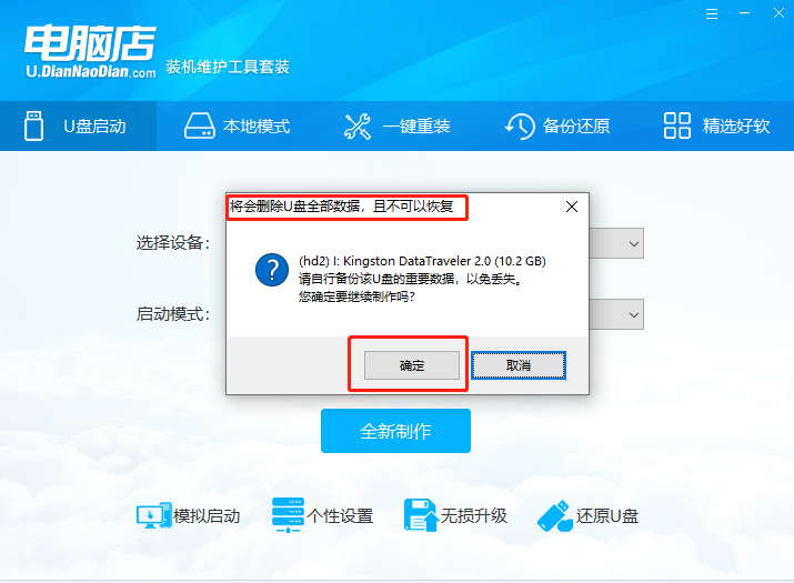 2、在彈出的信息提示窗口界面中,鼠標點擊"確定"進入下一步操作。(如下圖所示:U盤如有重要文件請保存到其它地方再開始制作)