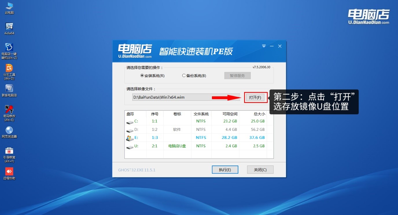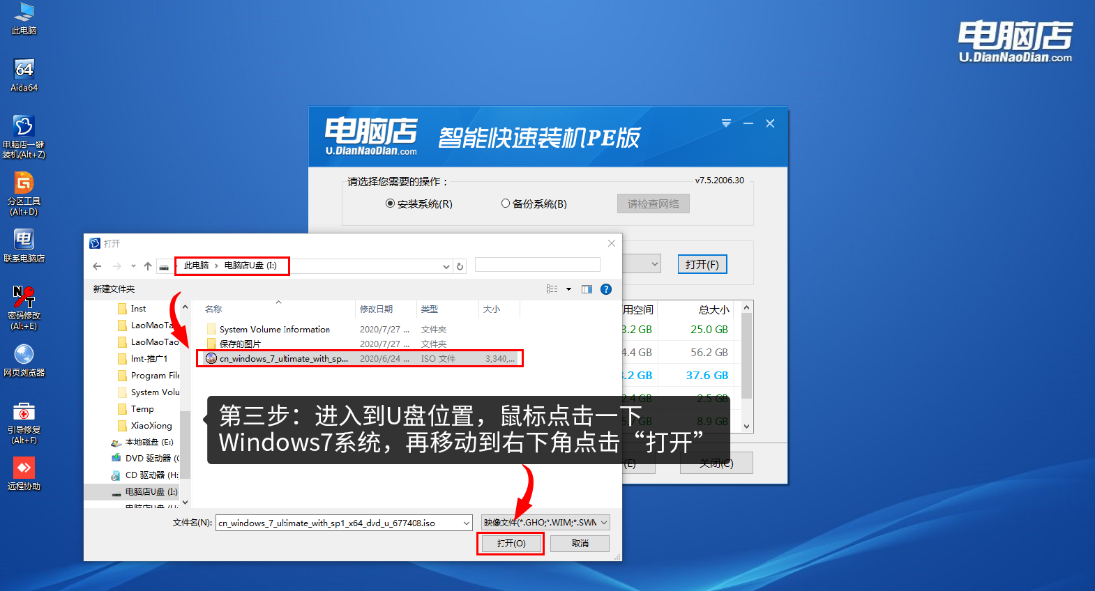 第二步、鼠標點擊“打開”選存放鏡像U盤位置(每個人存放不一樣,能查詢鏡像的位置就行)