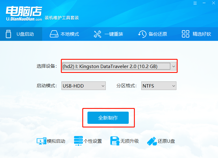 1、插入U盤到電腦,打開“電腦店U盤啟動盤制作工具”,(如沒有特殊的制作要求,使用默認的模式與格式就可以啦)點擊“全新制作”