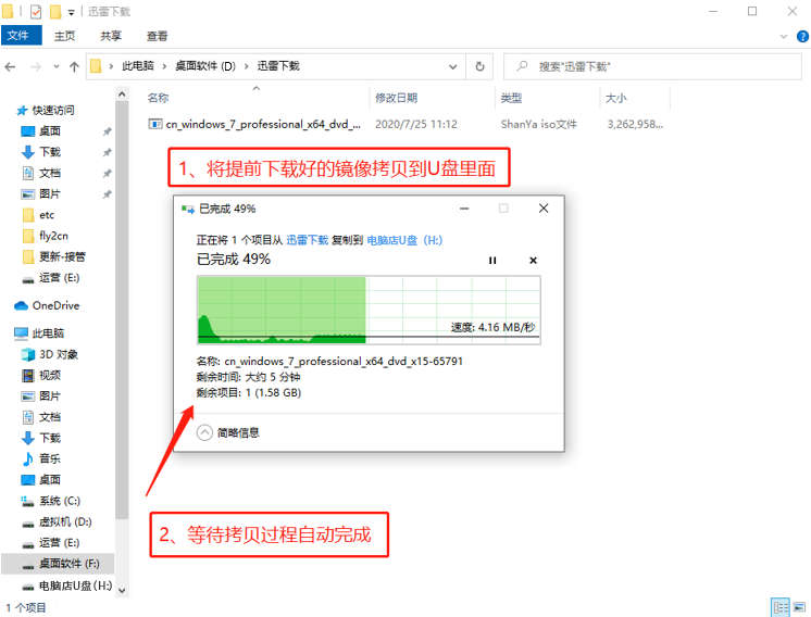6、下載完成后,接著找到下載好的WIN7 ISO/GHO鏡像拷貝到U盤目錄,由于ISO/GHO文件通常都比較大,耐心等待5~10分鐘。