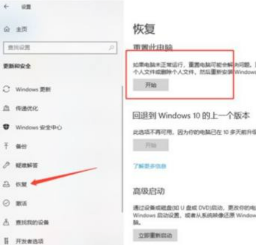 3.更新和安全主頁設置窗口界面中,接下來我們在左側找到恢復選項,再點擊開始