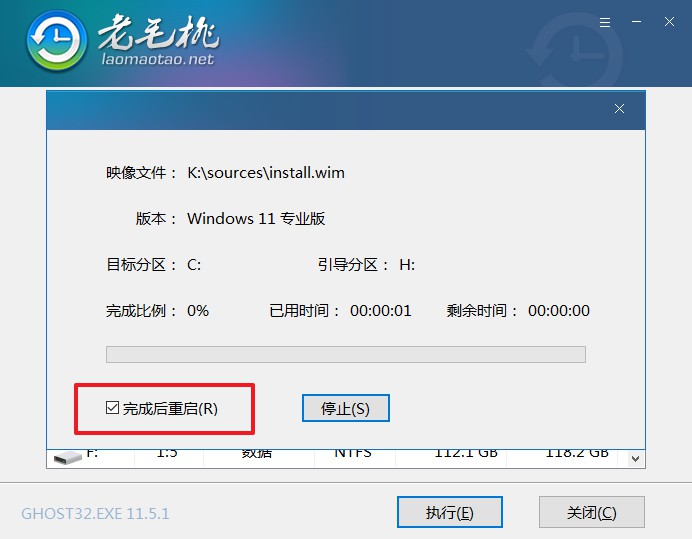 7、進入pe界面后,打開老毛桃一鍵裝機,選擇win11系統鏡像,安裝在c盤,點擊執行。