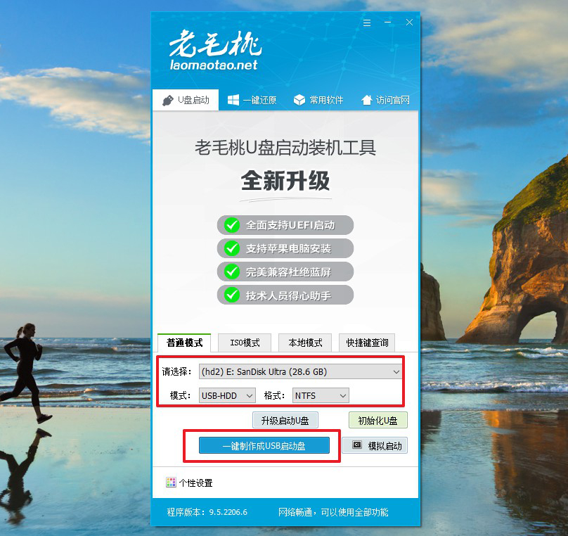 2、打開老毛桃u盤啟動盤制作工具,一鍵制作U盤啟動盤,注意制作u盤啟動盤之前,關閉電腦殺毒軟件。