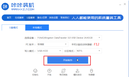 1. 首先,下載安裝咔咔一鍵重裝系統后打開,在一臺可使用的電腦上插入一個8g以上的空白u盤,點擊u盤重裝系統模式,選擇開始制作。