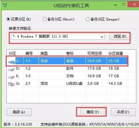 3、進入win8pe后會打開u啟動pe裝機工具之后,將準備好的win7系統鏡像儲存在c盤中,單擊確定。