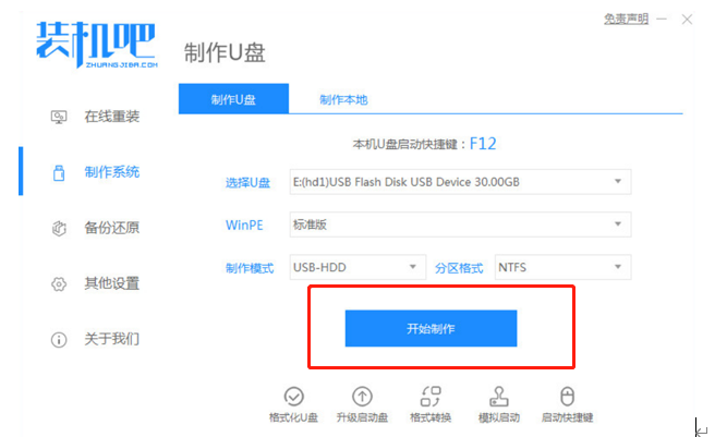 1、打開裝機吧工具軟件,插入U盤開始制作系統;