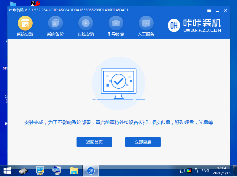 4、在pe系統內,咔咔裝機工具會自動安裝系統,完成后自動重啟電腦。