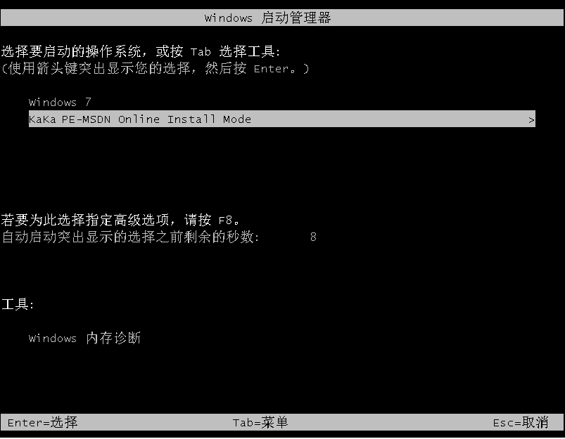 3、進入到啟動管理界面,會自動選擇kaka pe-msdn項進入。