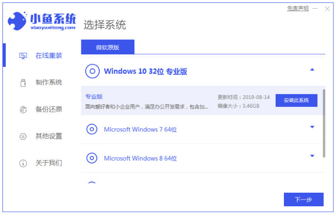 1、打開下載安裝好的小魚一鍵重裝軟件,選擇win10系統進行安裝,點擊安裝此系統,點擊下一步。