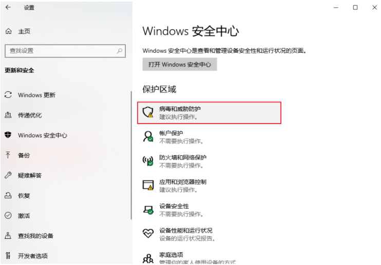 3、在windows安全中心界面下,鼠標點擊病毒和威脅保護。