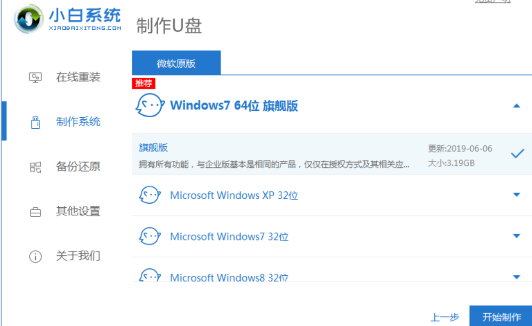 2、進入系統選擇界面選擇需要安裝的系統,點擊“開始制作”。