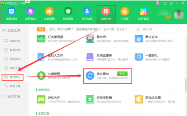 1、打開電腦的360安全衛士的功能大全,再點擊左邊的系統工具,找到系統重裝工具下載安裝好。(也可以打開瀏覽器直接查找“360系統重裝大師”進入官網下載)