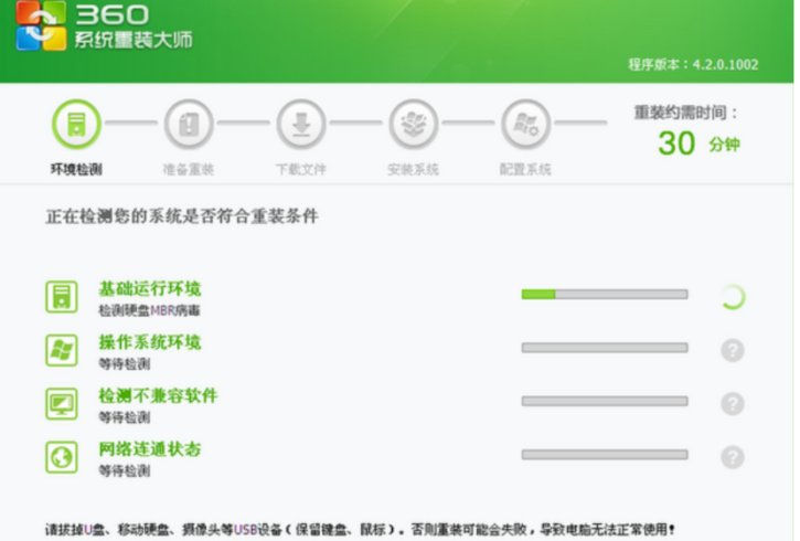 3、點擊 "重裝環境檢測"按鈕,等待軟件檢測系統是否符合重裝的條件。