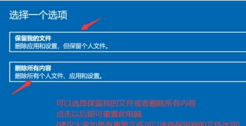 4、接著會彈出一個【初始化這臺電腦】的窗口,你可以選擇保存文件,或者刪除所有的內容(建議大家選擇【保留我的文件】,避免因為重裝系統而造成數據丟失)。選擇好后,就可以重置這臺電腦了。