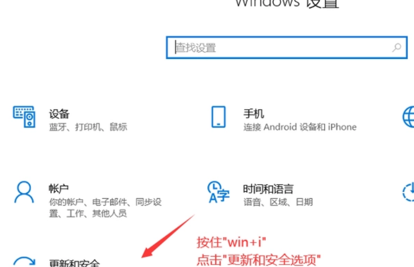 1、同時按下【Win+i】打開設置窗口,在界面下方找到【更新和安全選項】,并點擊它;