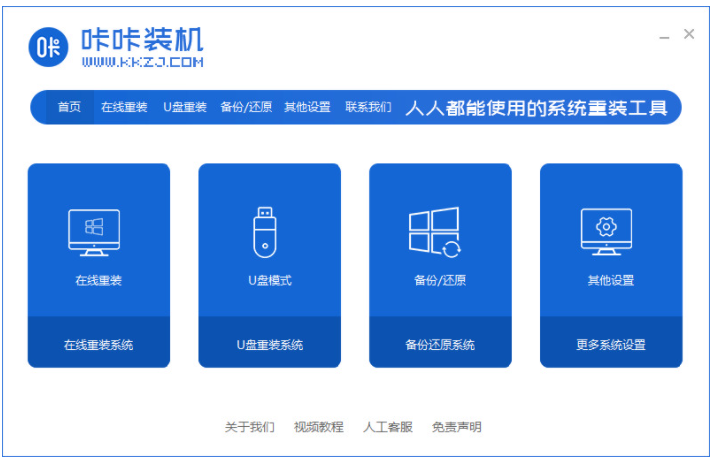 1、首先下載安裝咔咔裝機軟件,打開運行,點擊在線重裝。