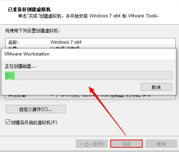 11、直接默認下一步,勾選“創建后開啟此虛擬機”,點擊“完成”,且稍等片刻,虛擬機正在創建磁盤。