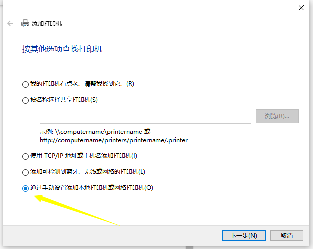 4、選擇“通過手動設置添加本地打印機或網絡打印機”,點擊“下一步”。