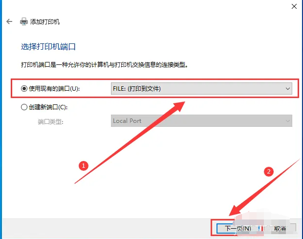 5、選擇使用現有的端口,點擊右側的下拉框,選擇“FILE: (打印到文件)”,點擊“下一步”。