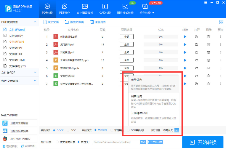 2、另外Excel和PPT文件也能夠轉換成Word文檔,這里也將它們都添加了進來,頁面下方可以選擇轉換格式和OCR文字識別,對于一些轉換的偏好設置,大家可以自行選擇。