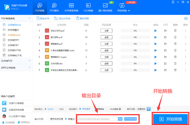 3、文件保存位置在下方輸出目錄中設置,點擊【開始轉換】,這樣PDF文件以及新添加進來對這些文件都會轉換成Word文檔啦。
