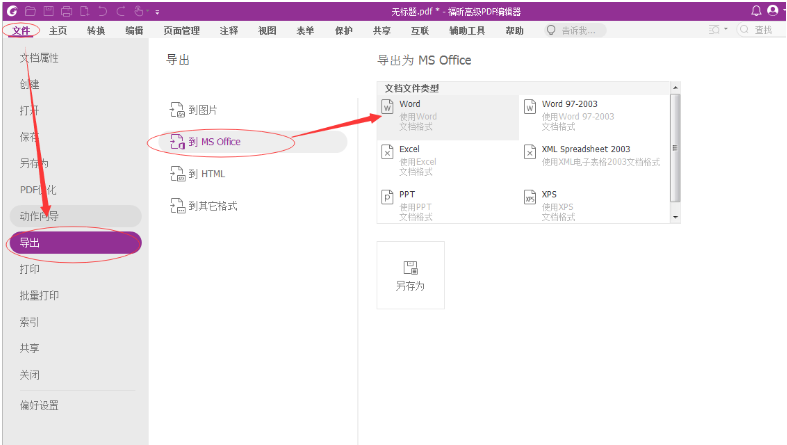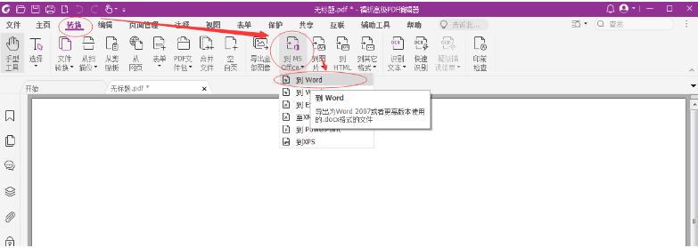 1、在福昕高級PDF編輯器中打開pdf文檔, 點擊菜單項轉換 >到MS office> 到Word,或者點擊菜單項 文件>導出>到MS Office>Word>另存為。