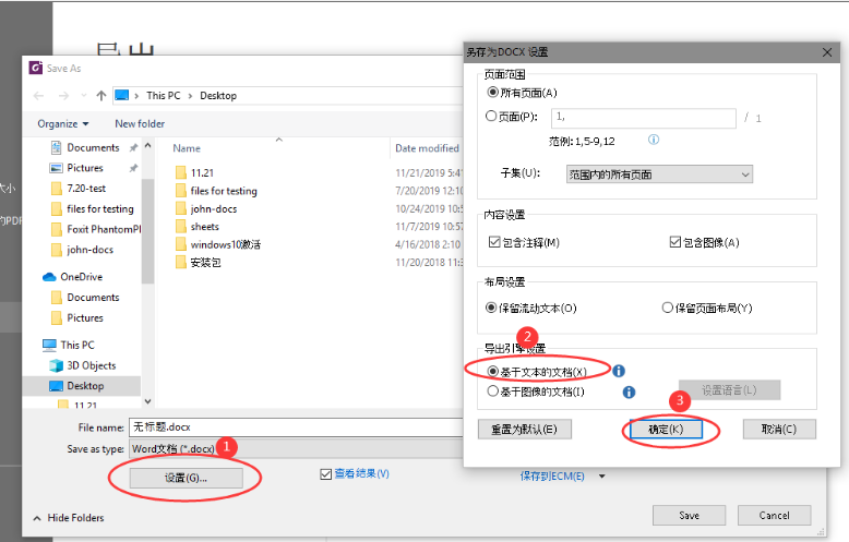 2、在另存為的對話框中,點擊左下角的“設置”按鈕,進入“另存為DOCX設置”彈出框。這邊有兩個導出引擎設置,一個“基于文本的文檔”,另一個是“基于圖片的文檔”。
