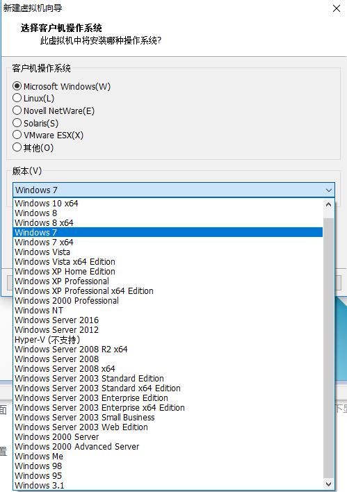 5、到這一步,我們需要選擇想在虛擬機上安裝的操作系統了,包括windows、liunx等等,今天的目的是為了學習如何安裝windows操作系統,所以我們選擇windows即可,然后在展開版本選項框,可以看到各個windows操作系統,根據需求選擇即可,此處我們以windows7來做演示: