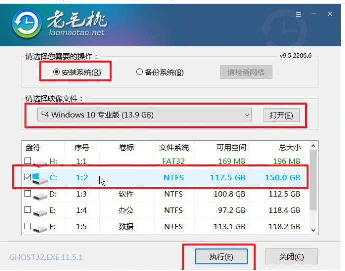 5.回車進入u盤系統桌面后,打開一鍵裝機工具,一般情況下會自動檢測win10鏡像,選擇安裝c盤,點擊執行。