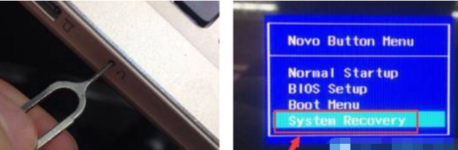將聯想小新Pro 16(2021)電腦強制關機,找一根卡針,插入筆記本的一鍵恢復小孔(不同筆記本恢復孔的位置不一樣),進入Novo Button Menu,按下方向鍵選擇,并回車System Recovery選項。