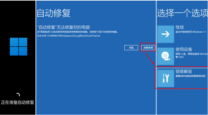 等待進入修復界面 - 查看高級選項 - 疑難解答。