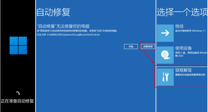 等待進入修復界面 - 查看高級選項 - 疑難解答。
