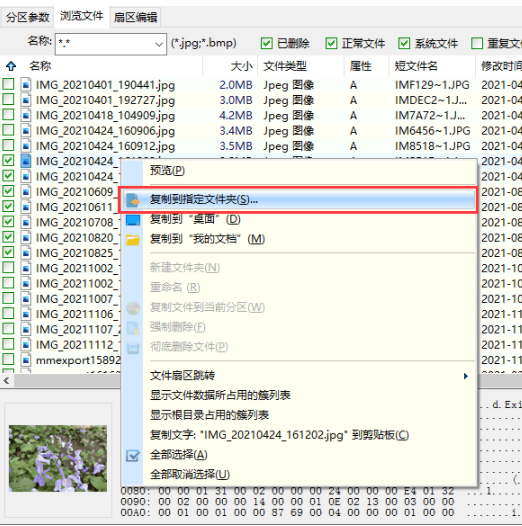 4、勾選我們需要恢復的文件,點擊并選擇"復制到指定文件夾"。即可在其他分區設置個文件夾來保存恢復的文件了。