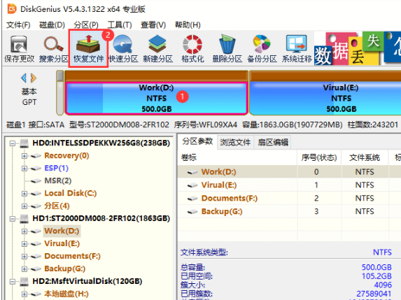 1、首先打開DiskGenius,選中丟失數據的分區,點擊"恢復文件"。