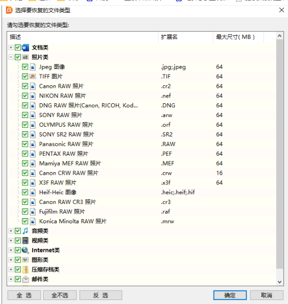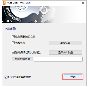 2、勾選需要所有的恢復選項,點擊"開始",開始搜索丟失的數據,在開始掃描之前,還點擊"選擇文件類型"按鈕,為深度掃描指定文件類型。