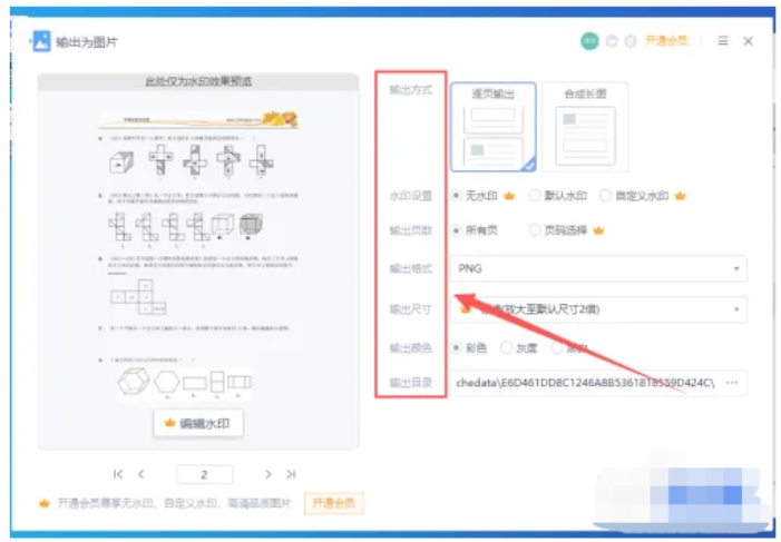 3.在彈出的對話框界面,設置輸出方式,然后依次對“水印”、“輸出頁數”、“輸出格式”等進行設置。