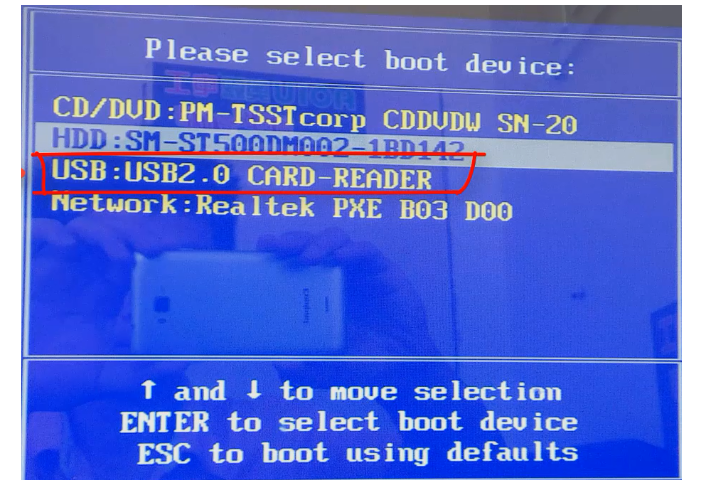 4、將u盤啟動盤插入需要重新安裝的計算機,開機時快速斷續地按下啟動快捷鍵進入快速啟動界面,選擇帶USB開頭的u盤啟動項返回鍵進入。