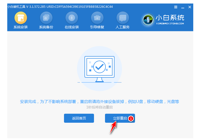 5、裝機軟件自動開始安裝,提示完成后立即重啟電腦。