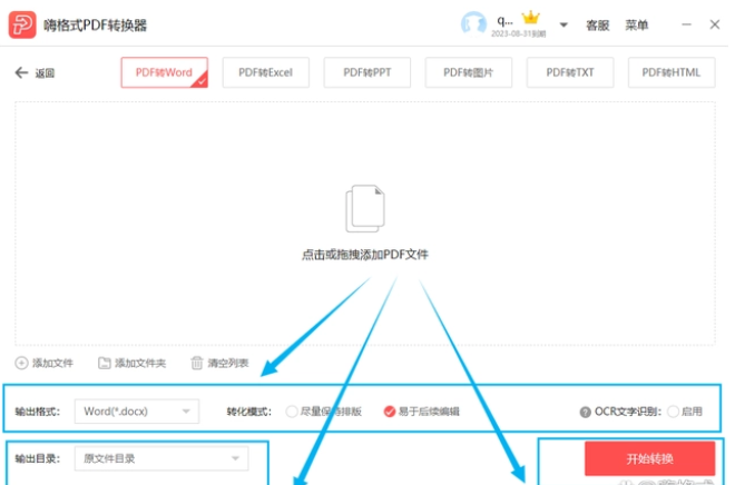3、添加pdf文件成功之后,點擊下方設置輸出格式、轉化模式以及輸出目錄,最后點擊“開始轉換”按鈕即可。