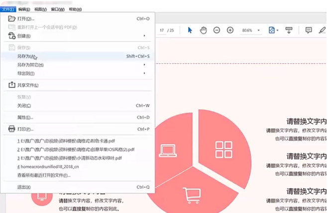 1、首先將需要轉換的pdf文件另存為word文件,打開pdf文件后,點擊左上角的“文件”,選擇其中的“另存為”。