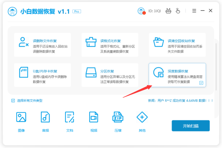 1、首先打開小白數據恢復軟件,功能欄上點擊“深度數據恢復”,點擊開始掃描。