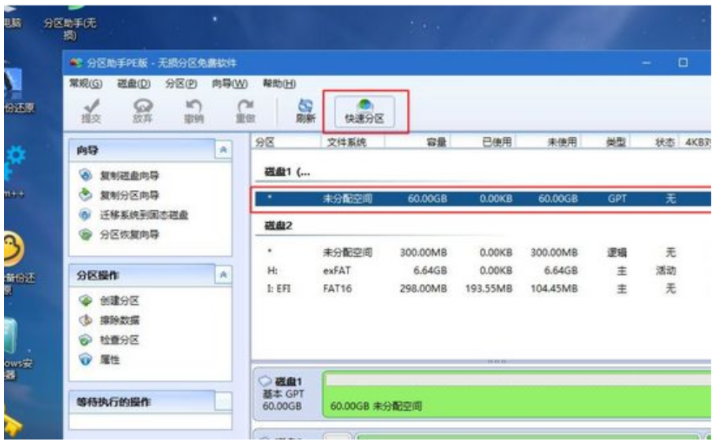 5、進入到pe系統之后,要在uefi下安裝win10系統,硬盤需要GPT分區表,鼠標雙擊桌面上的【分區助手(無損)】,選擇磁盤1,點擊【快速分區】,如果你是多個硬盤,要選對,根據固態硬盤大小選擇,注意不要誤刪。