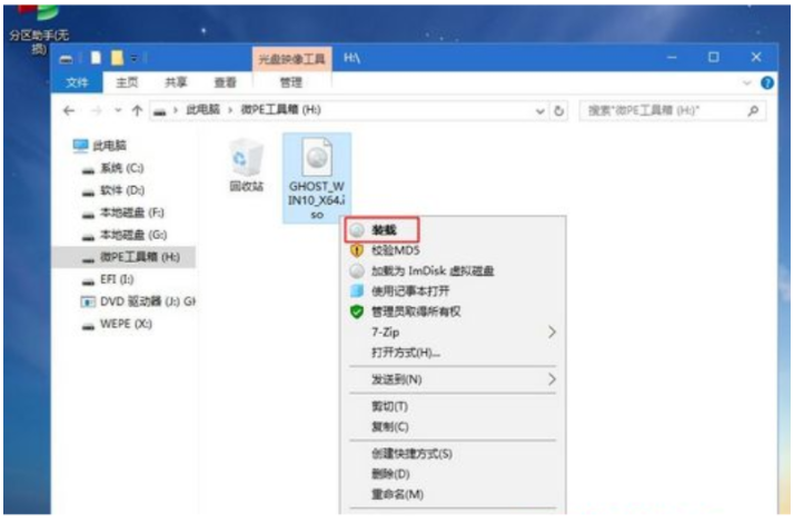 8、點擊打開此電腦—微PE工具箱,鼠標右鍵點擊win10系統iso鏡像,選擇【裝載】,如果沒有裝載選項的話,右鍵—打開方式—資源管理器。